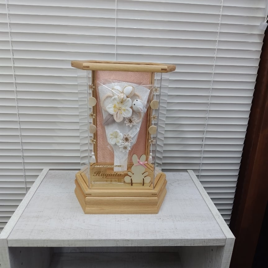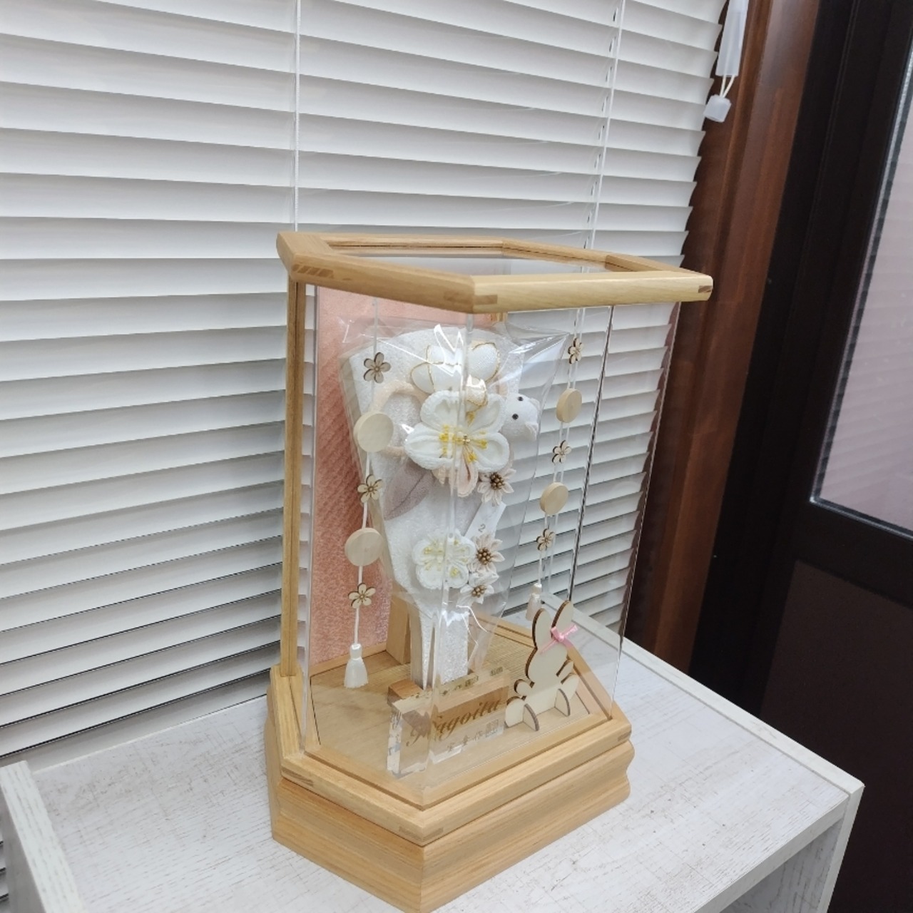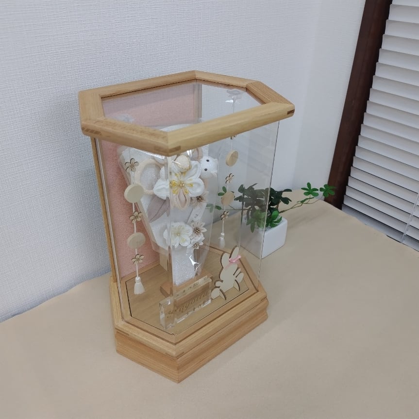 アクリルを使用した、木目の六角形ケースの羽子板飾りです。