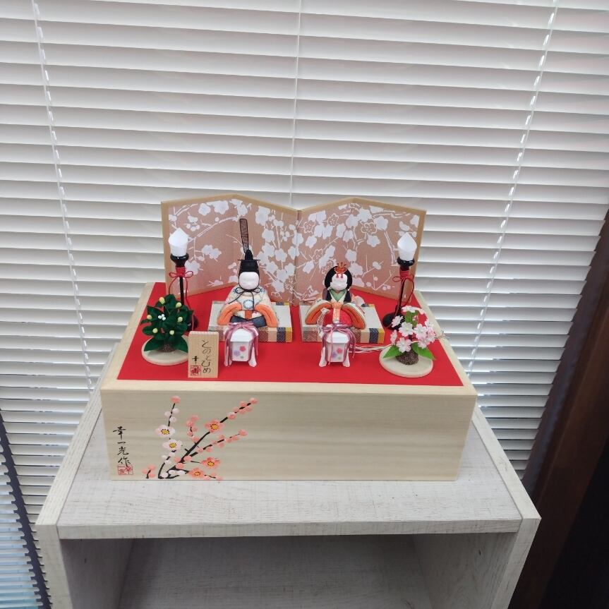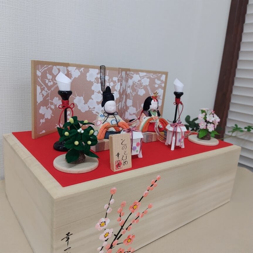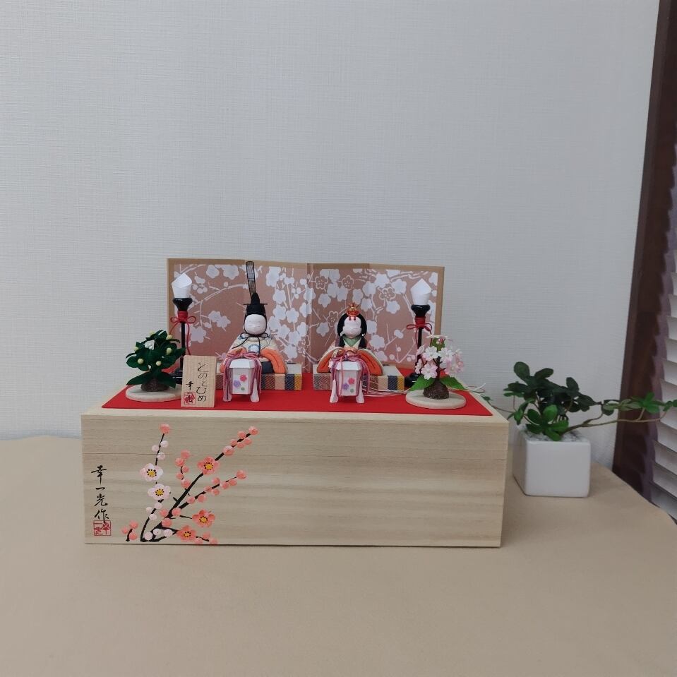 上品な桐箱に収められた、やさしい雰囲気の親王飾りです。