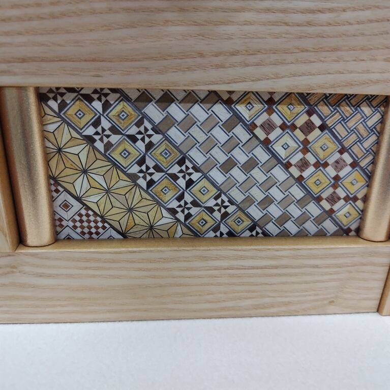 収納箱の前面には、伝統技法「寄木細工」が施されています。