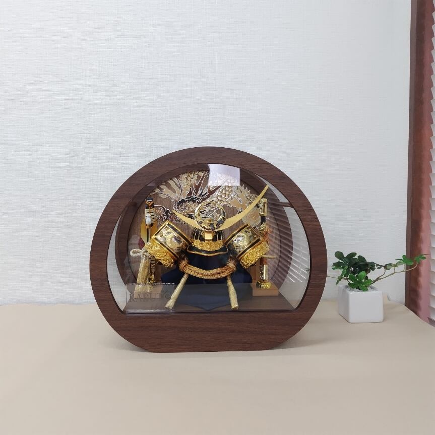 透明感のある丸型アクリルケースが、兜の美しさを引き立て、現代のインテリアにも自然に調和します。