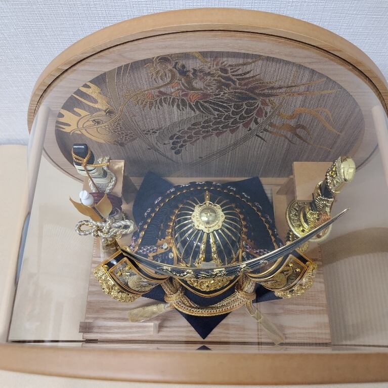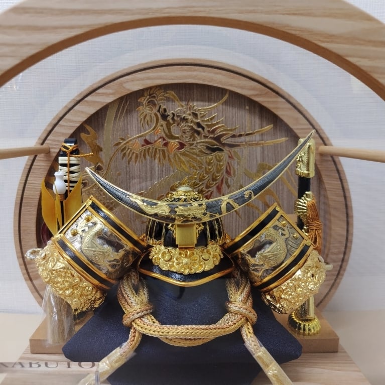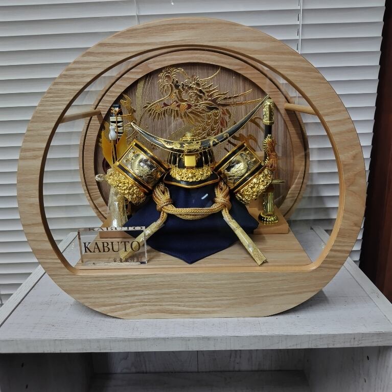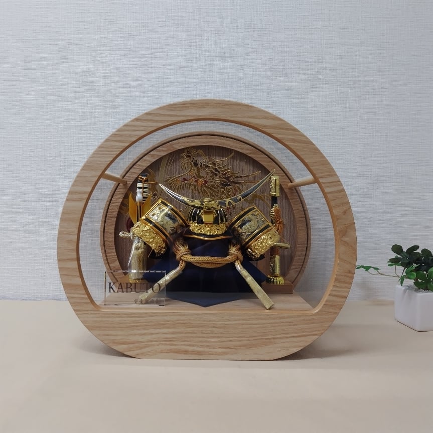 明るい木目の台と丸いフォルムがやさしい印象で、リビングや現代のインテリアにも自然に馴染みます。ケース背景や兜には龍のモチーフがあしらわれ、華やかさと力強さを兼ね備えたデザインです。