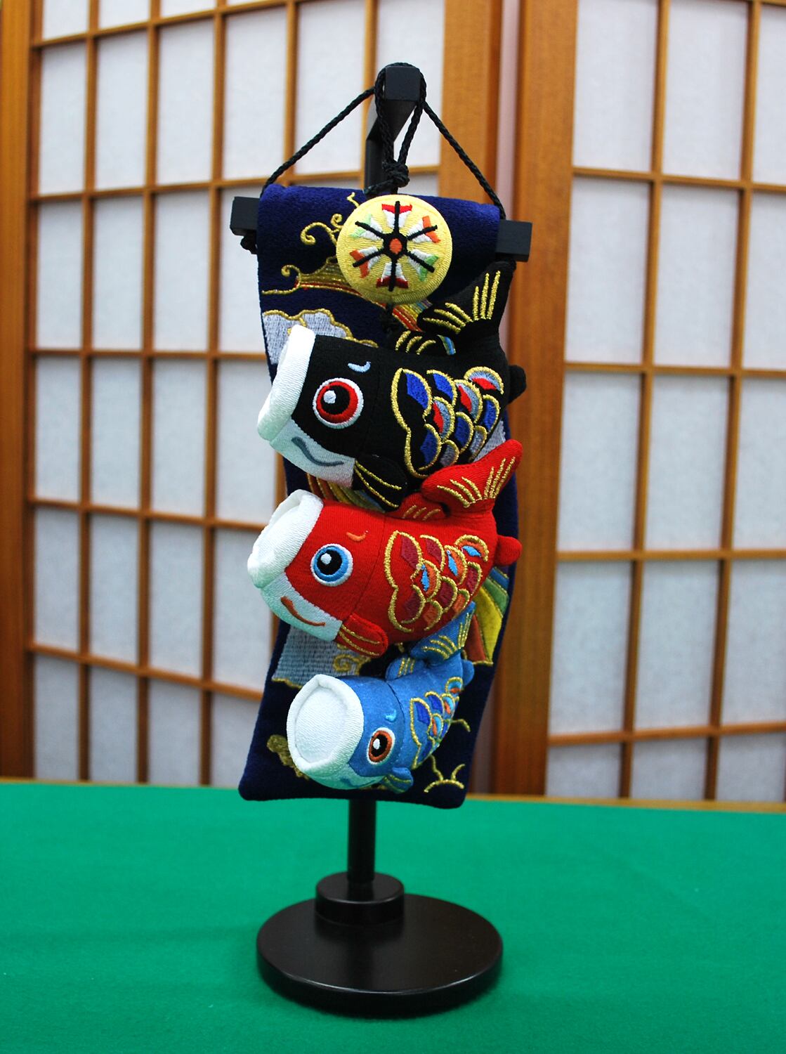 後ろの旗は紺色で、旗、こいのぼりには刺繍がほどこされていて、