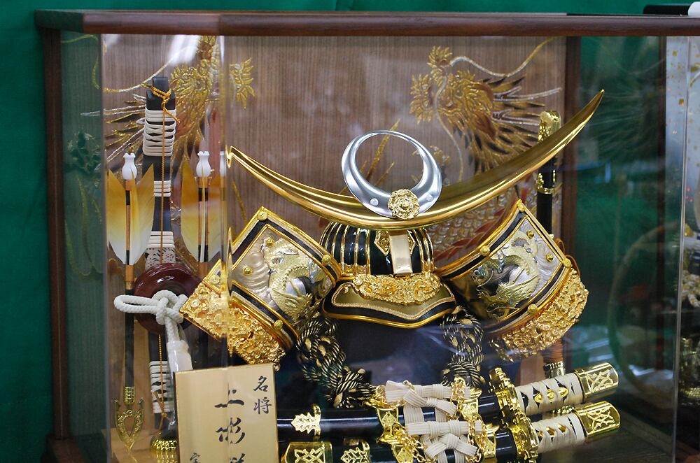木目がきれいなアクリルケース入りの兜飾りです