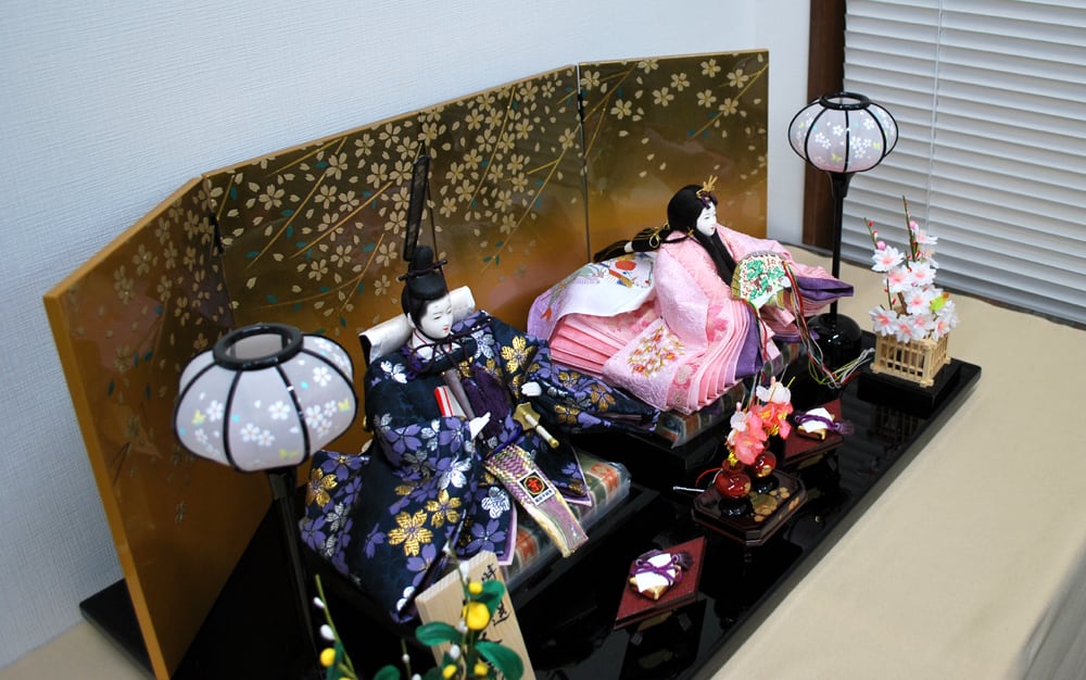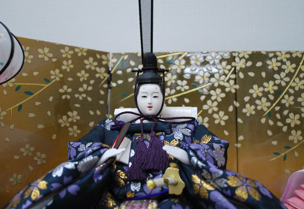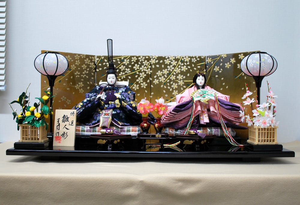 屏風の桜模様が春らしい雰囲気の親王飾りです。